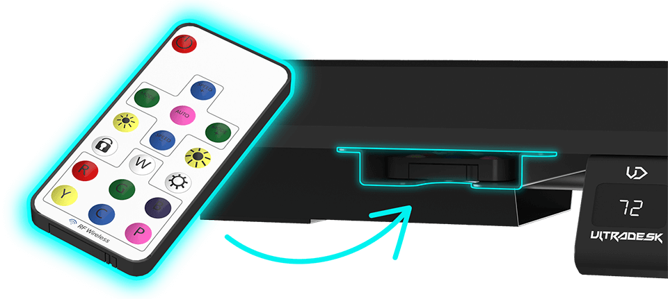 La télécommande compacte permet de configurer l’éclairage LED RGB PRISMATIC en un clin d’œil. Vous pouvez régler la luminosité et la couleur, activer des modes spéciaux, moduler la vitesse des effets lumineux ou éteindre complètement l’éclairage. La télécommande se range facilement dans un petit compartiment sous le bureau.