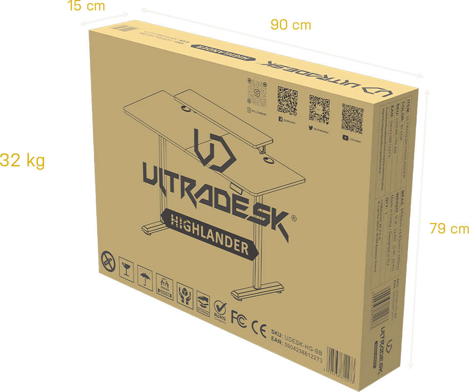 ULTRADESK HIGHLANDER est expédié dans un seul emballage spécialement protégé contre d’éventuels dommages. Les couches intérieures et extérieures de l’emballage protègent contre les influences nocives et les dommages mécaniques. De ce fait, le produit arrive toujours chez le client en parfait état !