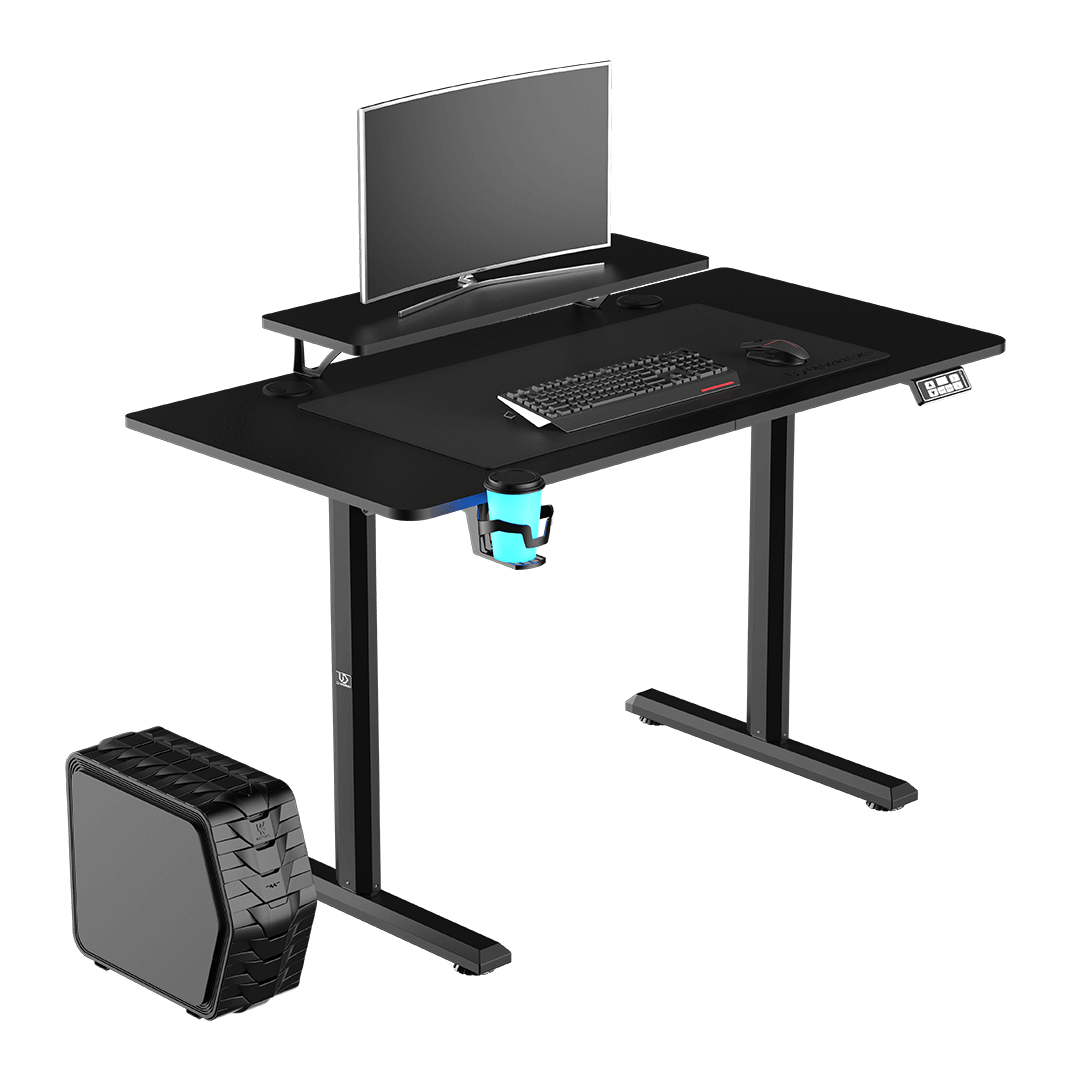 HIGHLANDER fonctionne parfaitement avec n’importe quel ordinateur basé sur un ou deux moniteurs, ou équipé d’un ordinateur portable. Le bureau sert également de base aux joueurs qui préfèrent les consoles vidéo. Grâce à la taille compacte de l’espace de travail, ce meuble s’intègre également dans de très petites pièces. Malgré sa petite taille, ce bureau offre suffisamment d’espace pour de nombreux accessoires et appareils externes utilisés pour jouer ou travailler.