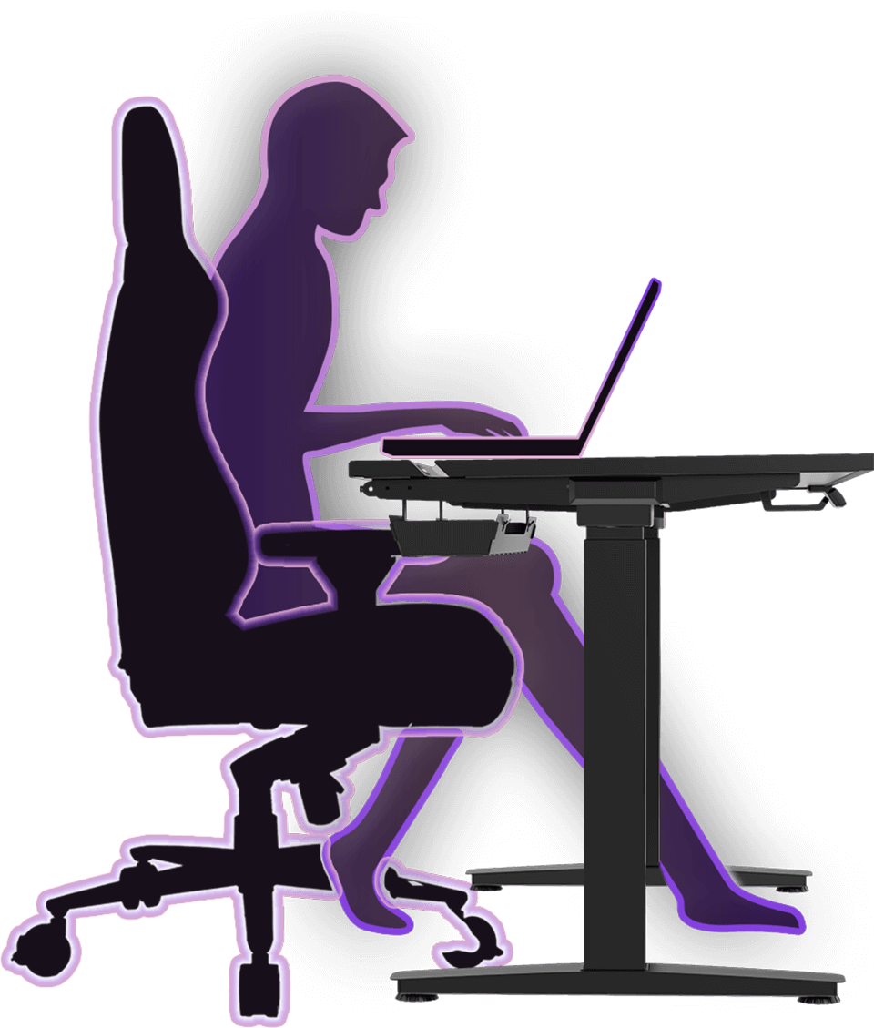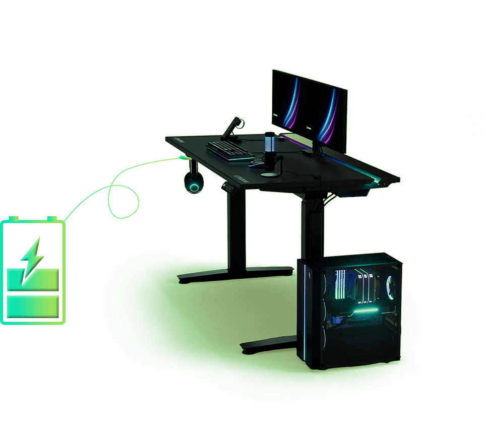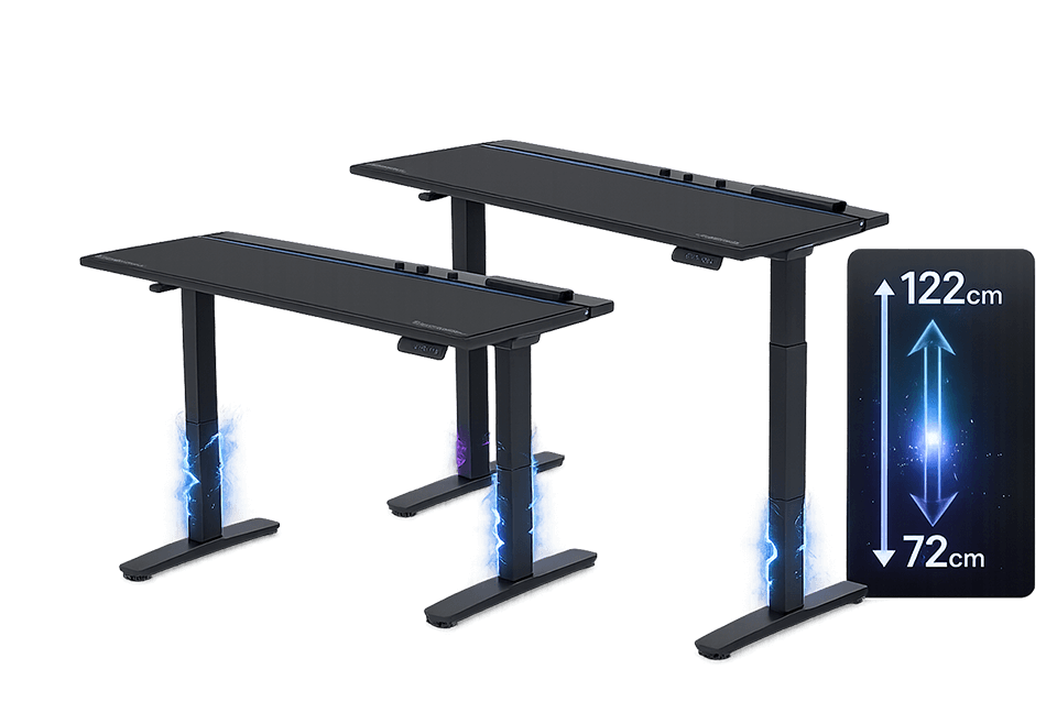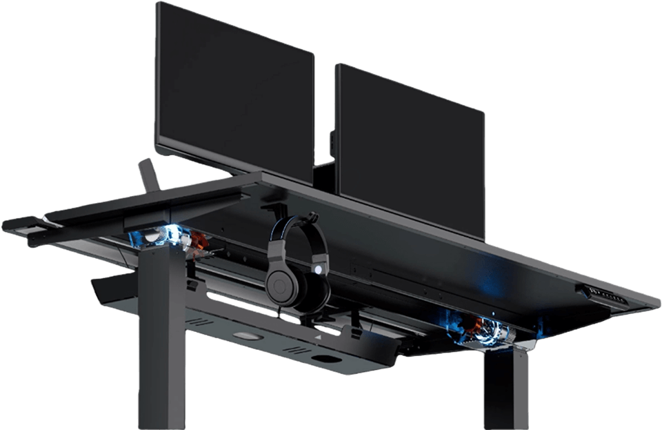 Le bureau gaming VORTEX est équipé de deux moteurs électriques distincts intégrés aux supports latéraux, ce qui lui confère une capacité de charge et une durabilité accrues. Ces deux moteurs consomment un minimum d’électricité. Silencieux, ils soulèvent le plateau de travail de manière uniforme et sécurisée à une vitesse de 25 mm/s. À plusieurs mètres de distance, ils sont totalement inaudibles, garantissant ainsi la tranquillité des autres occupants du logement.