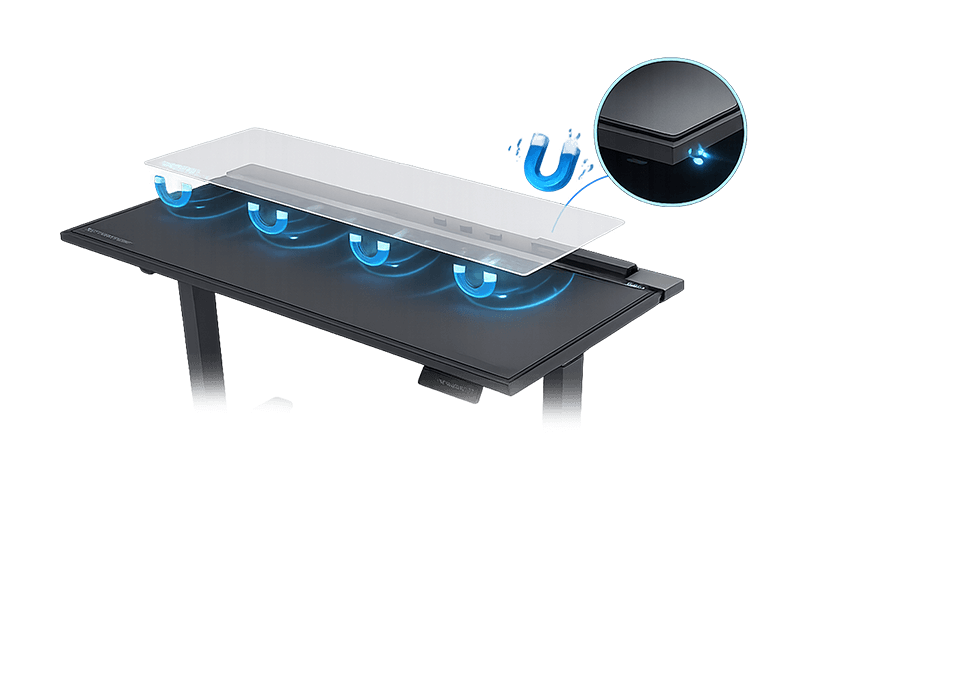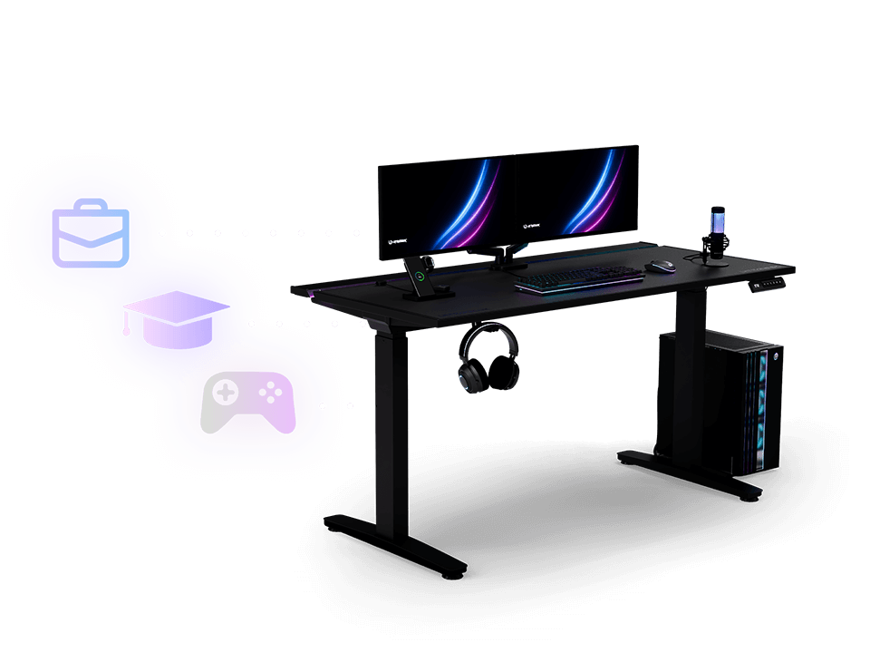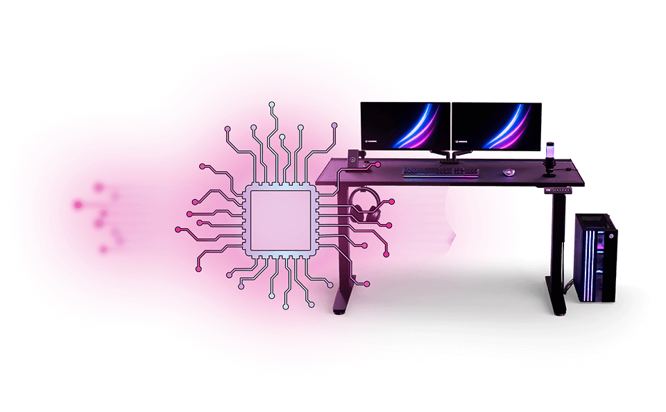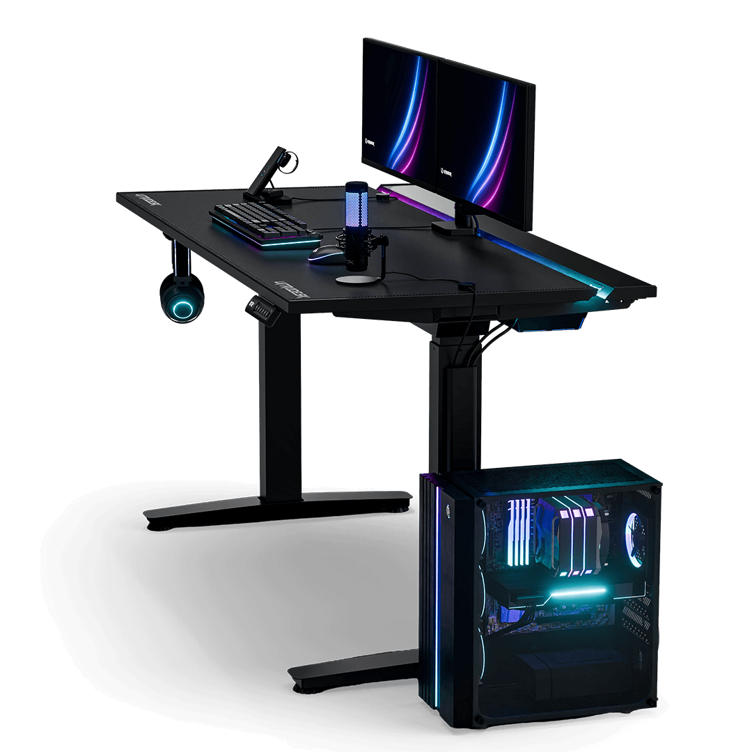 Le bureau gaming VORTEX est équipé de deux moteurs électriques distincts intégrés aux supports latéraux, ce qui lui confère une capacité de charge et une durabilité accrues. Ces deux moteurs consomment un minimum d’électricité. Silencieux, ils soulèvent le plateau de travail de manière uniforme et sécurisée à une vitesse de 25 mm/s. À plusieurs mètres de distance, ils sont totalement inaudibles, garantissant ainsi la tranquillité des autres occupants du logement.