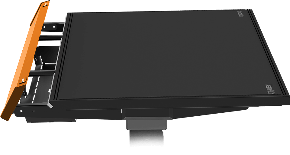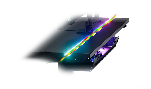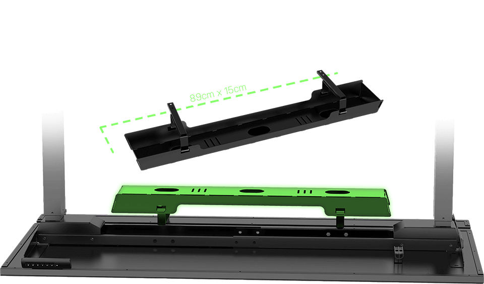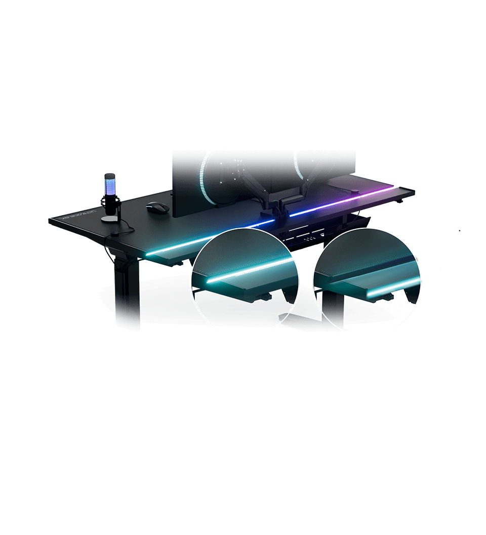 Ce plateau monobloc de 21 mm d’épaisseur supporte sans problème le poids des configurations de jeu les plus puissantes. Au besoin, vous pouvez y poser un boîtier PC en toute sécurité. Un module d’éclairage au design élégant est intégré sur toute la longueur du plateau. Sa forme rectangulaire régulière permet un alignement précis avec les murs de la pièce.